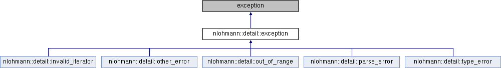 This class is an extension of std::exception objects with a member id for exception ids. It is used as the base class for all exceptions thrown by the basic_json class. This class can hence be used as "wildcard" to catch exceptions.